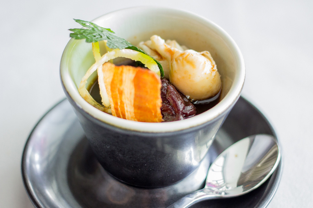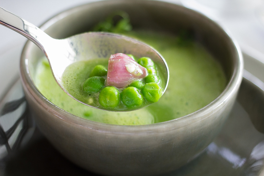 จานแรกนะครับ ซุปถั่วลันเตารสมินต์กับหมูอิเบริโคจากสเปน ในจานนี้ผมชอบมากสุดคือถั่วลันเตา กับตัวซุปครับ