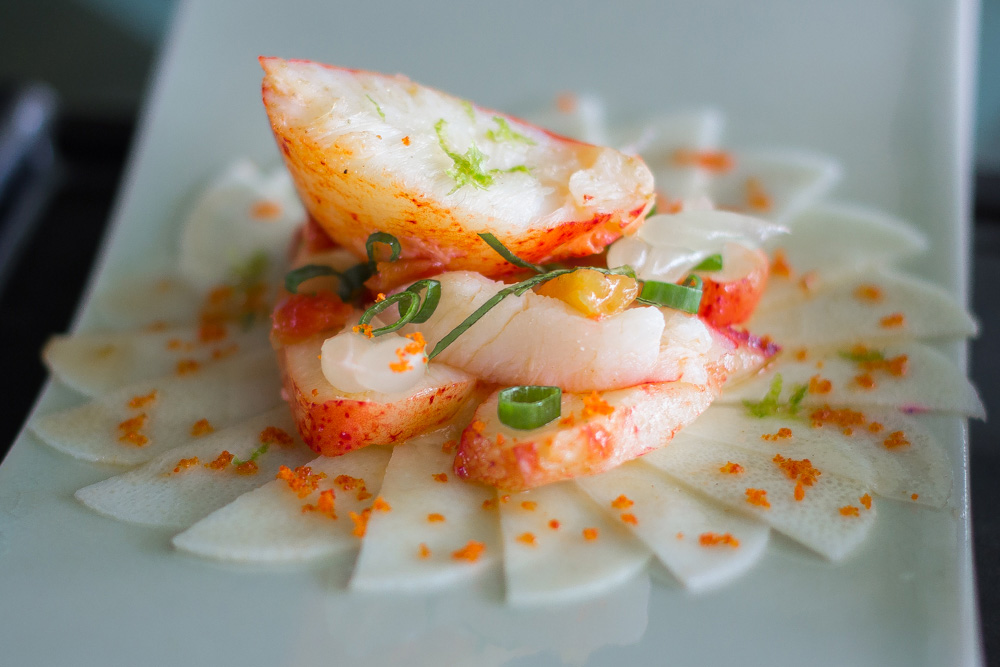 อันนี้เป็นล็อบสเตอร์ แผ่นบางๆนั่นเป็นยอดมะพร้าวอ่อนราดซอสมะนาว ล๊อบสเตอร์หวานดีครับ หนึบๆ