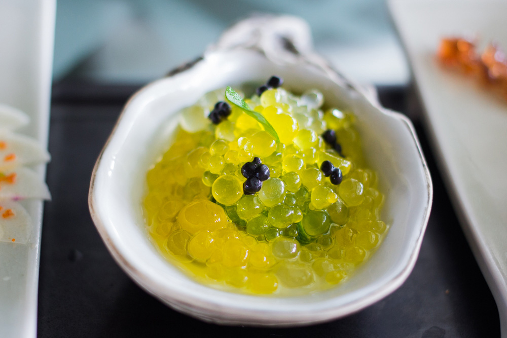 อันนี้เด็ดครับ ชอบมากกกกกก เม็ดๆที่เห็น สีขาวทำมาจากน้ำทะเล สีเหลืองทะมาจากมะกรูด ข้างใต้เป็นหอยนางรมห่อด้วยใบอะไรไม่รู้สีเขียว