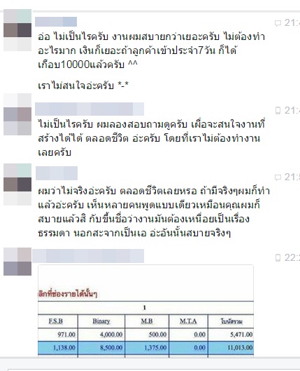 ผมนึงคนกำลังนั่งดูการ์ตูนมันส์ๆอยู่เลย แล้วมีข้อแจ้งเตือนเฟสมาเราก็คิดว่าเพื่อนเรา+ตอนนั้นกำลังเบื่อๆเหงาๆอยู่เลย ที่ไหนได้มาชวนทำงานออนไลน์ผมเลยคุยกับเขายาวเลย ผมไม่ใช่เด็กๆนะครับที่จะมาหลอกหรือสอนผมได้ ผมทำงานมาหลายปีแล้วประสบการณ์งานผมอาจจะเยอะกว่าคุณก็ได้(ย่อตัวเองนิดนึง) คุณไม่ต้องมาสอนผมหรอก อีกอย่างผมก็พูดปัดๆแล้วว่าไม่ทำเขายังไม่รู้สึกตัวอีกยังเอานุ้นมาเปรียบนี้อีก(ตื้อจริงๆเลย) วันนี้ให้อ่านอะไรเกี่ยวกับบทสนทนาผมกับเขาให้ดูละกัน