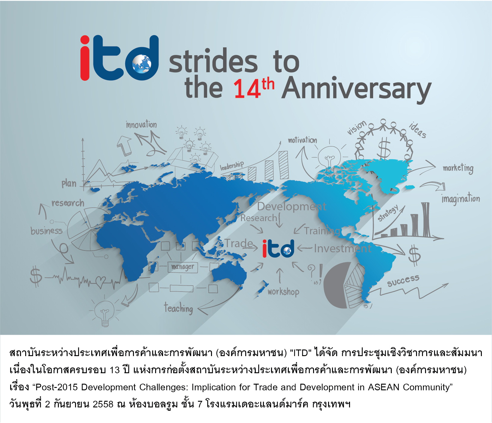 เนื่องในโอกาสก้าวสู่ปีที่ 14 ของการก่อตั้ง สถาบันระหว่างประเทศเพื่อการค้าและการพัฒนา (องค์การมหาชน) หรือ ITD จึงได้จัดให้มีการประชุมวิชาการนานาชาติเรื่อง “ความท้าทายแห่งการพัฒนาภายหลังปี 2558: นัยต่อการค้าและการพัฒนาภายในประชาคมอาเซียน” หรือ “Post-2015 Development Challenges: Implications for Trade and Development for ASEAN Community” ขึ้น เพื่อเป็นเวทีแลกเปลี่ยนเรียนรู้ แลกเปลี่ยนความคิดเห็นของผู้ทรงคุณวุฒิทั้งในและต่างประเทศ นักวิชาการ นักวิจัย นิสิต นักศึกษา และบุคคลทั่วไป โดยไฮไลท์สำคัญจะได้จัดให้มีการจัดแสดงนิทรรศการผลงานสำคัญที่ผ่านมาของสถาบันฯ ด้านการวิจัย การฝึกอบรม การพัฒนาศักยภาพบุคลากร อนึ่ง สถาบันระหว่างประเทศเพื่อการค้าและการพัฒนา (องค์การมหาชน) หรือ ITD จัดตั้งขึ้นเพื่อสอดรับกับความตกลงว่าด้วยความร่วมมือระหว่างรัฐบาลไทยกับที่ประชุมสหประชาชาติ ว่าด้วยการค้าและการพัฒนา หรือ อังค์ถัด (United Nations Conference on Trade and Development หรือ UNCTAD) โดยมุ่งส่งเสริมการวิจัย การฝึกอบรม การพัฒนาศักยภาพบุคลากร เพื่อเป็นแหล่งเผยความรู้เพื่อการพัฒนาที่เป็นประโยชน์แก่ประเทศกำลังพัฒนา เพื่อให้พัฒนาการค้าให้ดีขึ้น