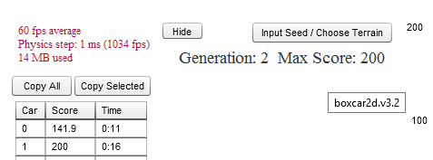ทางซ้ายจะมีการบอกรุ่น (generation) ที่กำลังทำการทดสอบและระยะทางที่รถแต่ละคันทำได้