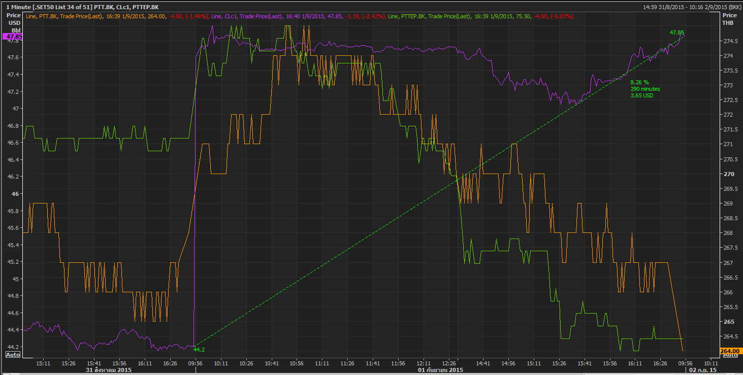 น้ำมันดิบบวกจากราคาบ่ายสี่โมงครึ่งเมื่อวาน 8% วันนี้พี่เทพ -5% พี่ปอ -1.5% ซะงั้น