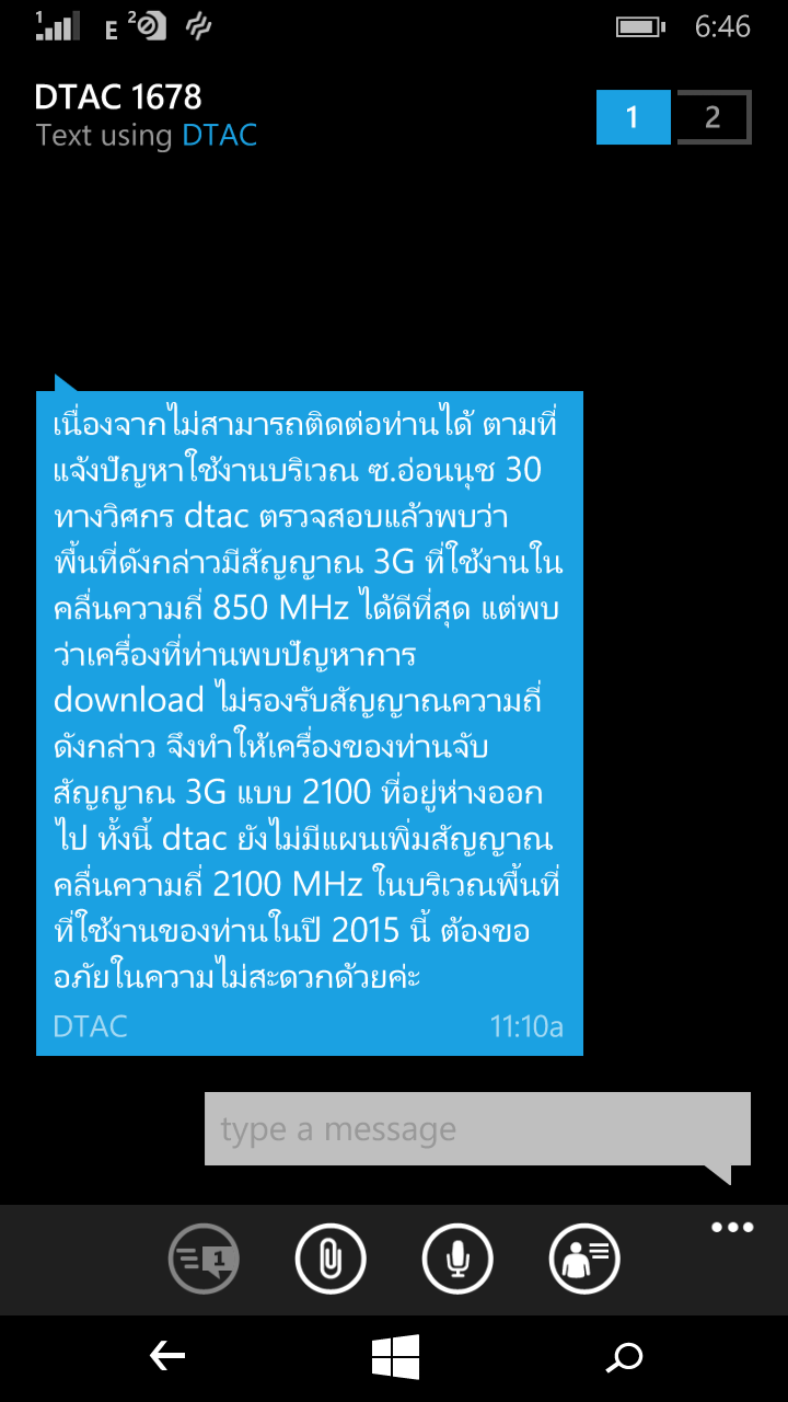 http://pantip.com/topic/34110659 ที่ผมได้แจ้งปัญหาความเร็วอินเตอร์เน็ตทั้ง 3G และ 4G ของดีแทคที่ซอยอ่อนนุช 30 วันรุ่งขึ้นทางเจ้าหน้าที่ก้โทรมาสอบถามข้อมูลเพิ่มเติม และแจ้งว่าจะลงพื้นที่ตรวจสอบสัญญาณ พอมาวันนี้ผ่านไปเพียงวันเดียว ทางที่ดีแทคก็โทรมาแจ้งผลแต่เนื่องจากผมทำงานจึงไม่ได้รับสายจึงส่งเป็นข้อความมาตามภาพ