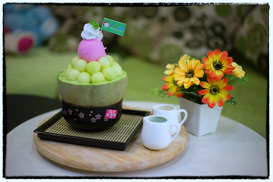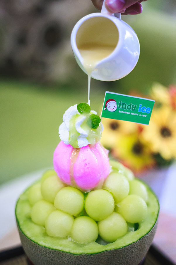 เมนู แรก บิงซู เมล่อน มีไอครีมรสลิ้นจี่ข้างบน(เลือกรสอื่นได้) มีนมข้นและน้ำเขียวๆราด
