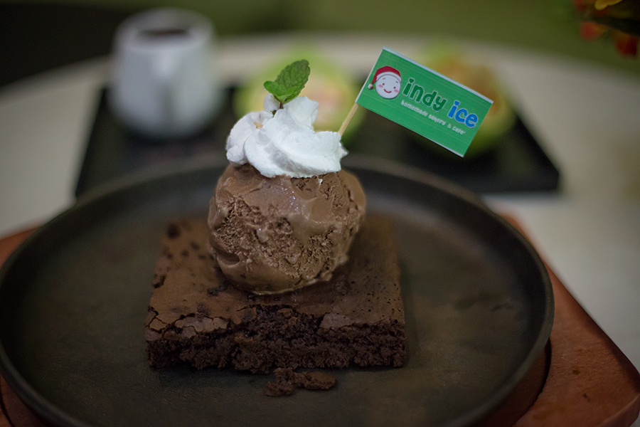 เมนูที่ 2 บราวนี่กะทะร้อนครับ ถือเป็นไอเดียร์สร้างสรรค์ของเจ้าของร้านมากครับ เอาชอคโกแลตมาราดใส้กะทะร้อนๆ ฟู่ๆๆ อารมณ์เหมือนหอยทอดกะทะร้อนอ่ะครับ แต่ผมถ่ายตอนฟู่ๆไม่ทันเลยเอารูปก่อนราดมาให้ชมแทน ข้างบนโป๊ะด้วยไอครีม รสDouble choccolate เข้มข้น มากๆครับ