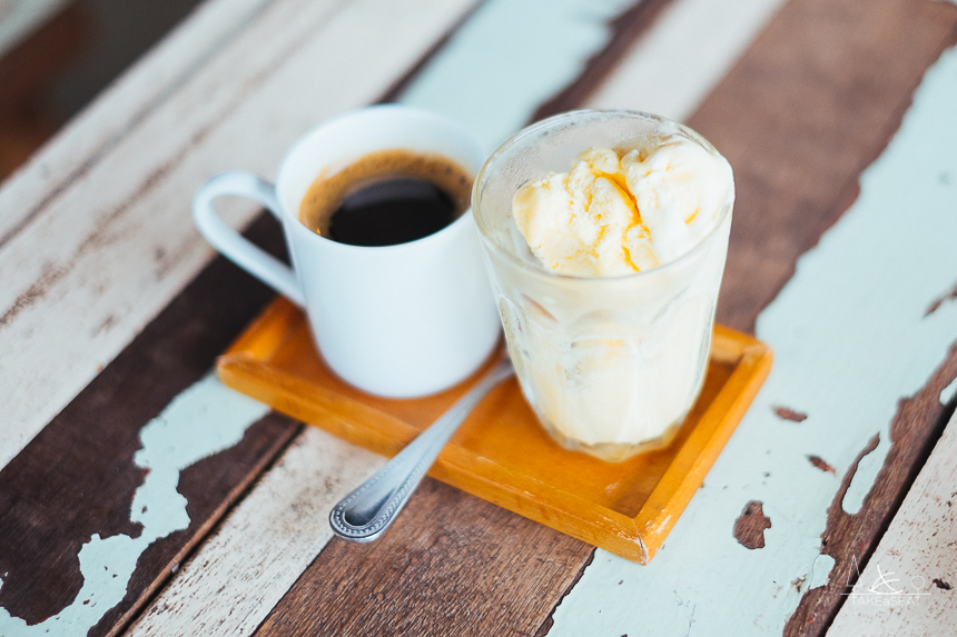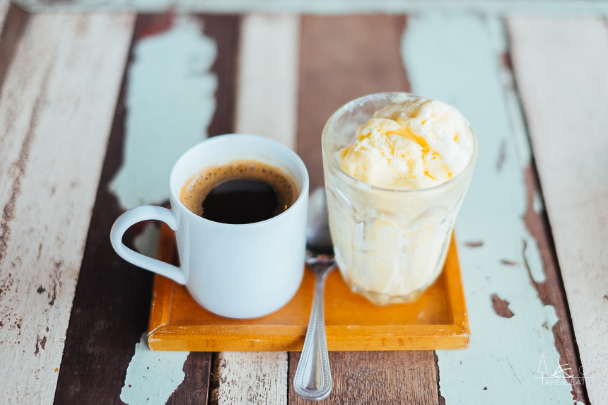 ทางร้านจะเสิร์ฟมาให้เป็น กาแฟร้อนกับ ไอศครีมวนิลลา คู่กันอย่างงี้เลย
