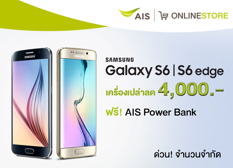 สำหรับลูกค้าเอไอเอส ตอนนี้ มีโปรลดราคามือถือ Galaxy S6 ทุกรุ่น ลด 4,000 บาท บวกPower Bank ต้องสั่งผ่านออนไลน์ของ Ais Online Store เท่านั้น