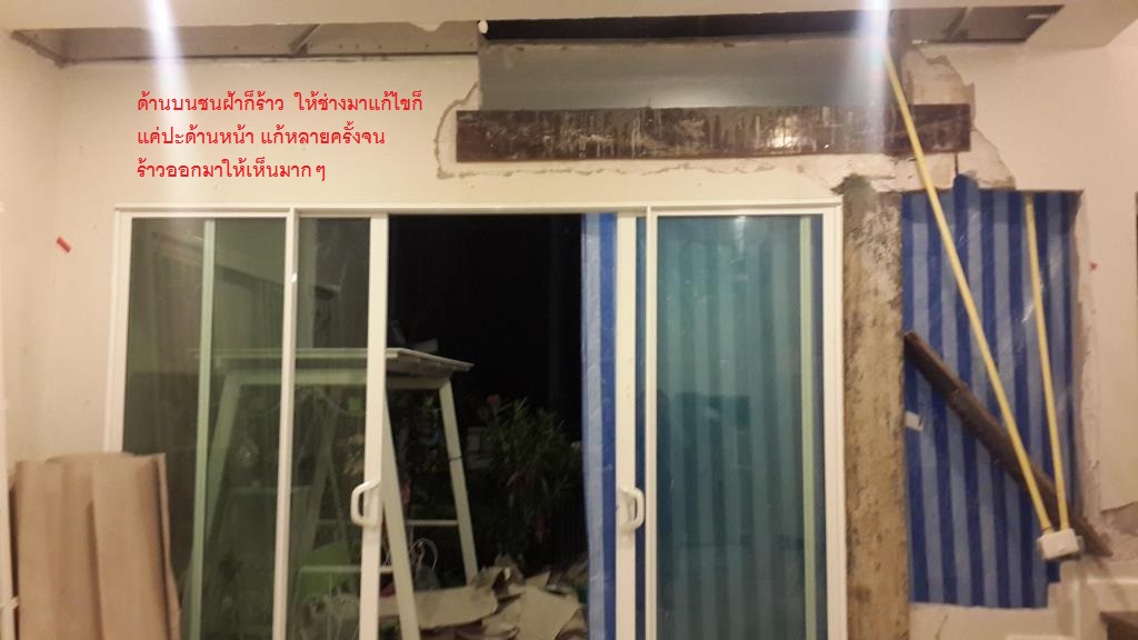 ต่อมาอาการร้าวจากเป็นลายงา ก็เริ่มใหญ่ขึ้น รอยด้านหน้าและด้านหลังชนกันเลย คิดว่าน่ากลัวละรอยแบบนี้ ก็เรียกช่างมาดู (จากที่อยู่มา 3 เดือนแก้ไปเรื่อยๆ แก้หายบ้าง ไม่หายบ้าง นำ้รึ่วซึมเข้าบ้าน ก็เลยมาเกือบจะปีแล้ว สัญญาประกันจะครบแล้ว)