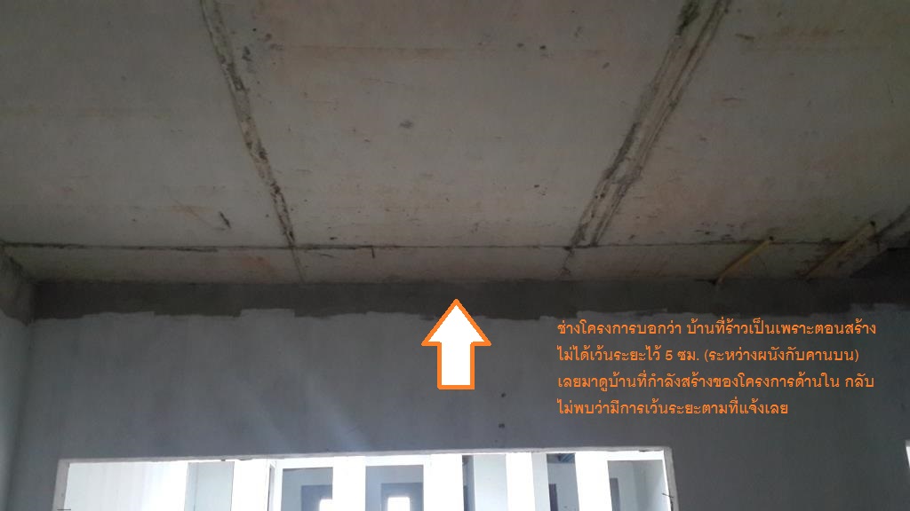 ช่างโครงการมาดูบอกว่าต้องโอนให้ช่างหลังการขาย ก็รอๆๆๆ พอช่างคนนั้นมาถึง ก็บอกว่า เป็นเพราะผู้รับเหมาที่ดูแลเฟสนี้ สร้างชุ่ย โครงการไล่ไปแล้ว ก็บ่นๆ ว่าต้องมาดูแลงานยากๆ และบอกว่าเป็นเพราะผุ้ัรับเหมาสร้างแบบไม่ได้เว้นช่วงผนังกับฝ้าด้านบน (ภาพประกอบนะคะ) คือต้องเว้น 5 ซม. เพื่อคานน้ำหนัก แต่พอไม่เว้นก็ร้าวขึ้น (ทั้งเฟสสร้างโดยผู้รับเหมาแย่ๆนี้ มีบ้าน 7 หลังติด หลังอื่นๆ เริ่มกลัวว่าจะร้าว เพราะหลังที่ 2 ร้าวแบบเดียวกันแล้ว)