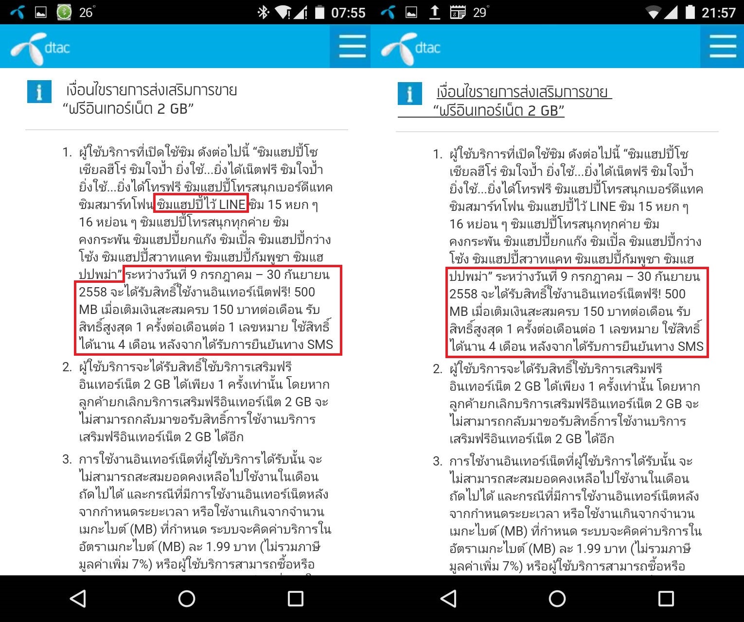 มาวันนี้ผมได้เข้าไปตรวจสอบข้อมูลโปรโมชั่นดังกล่าวปรากฏว่าได้มีการแก้ไขข้อมูลไปเรียบร้อยไปแล้วจาก 500MB/เดือนเป็น 500MB ใช้ได้แค่ 7 วัน (ตามภาพประกอบด้านล่าง)