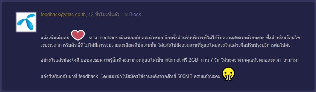 ผมจึงส่งข้อมูลทั้งหมดให้ Feedback ตรวจสอบ แต่ก็ได้รับคำยืนยันว่าเน็ต 500MB ใช้ได้แค่ 7 วันเท่านั้น ผมจึงส่งข้อมูลตามรูปภาพตั้งแต่ต้นให้ Feedback ตรวจสอบความถูกต้อง แล้วก็รอการติดต่อกลับ