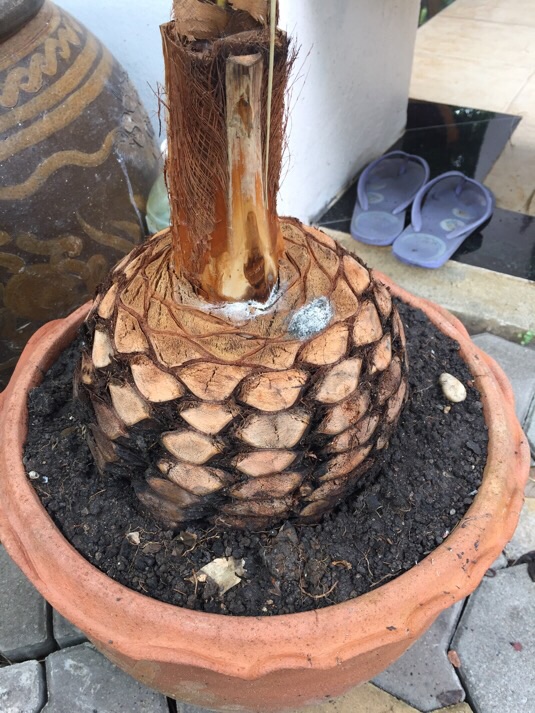 ตรงโคนต้นค่ะ เราเห็นข้างนอกเชื้อรามันกินเยอะมากเลย ก็ฉีดยา แล้วคิดได้ว่า ควรตัดส่วนที่ป่วยทิ้ง พอตัดแล้ว แม่เจ้า!! ตรงแกนในของก้านมันเป็นสีน้ำตาลแล้วค่ะ เหมือนโดนกินไปแล้ว ส่วนอื่นของต้นย