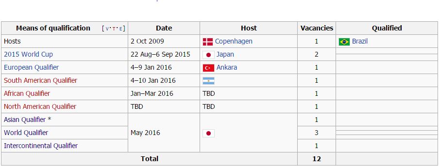 โอลิมปิก 2016 ที่ริโอ Process การคัดเลือกอัพเดทล่าสุด เจ้าภาพ บราซิล อันดับ 1 และ 2 จาก World Cup 2015 แชมป์ทวีป 5 ทีม ( อเมริกาเหนือ , อเมริกาใต้ , แอฟริกา , เอเชีย , ยุโรป ) 3 ทีมจาก World Olymp