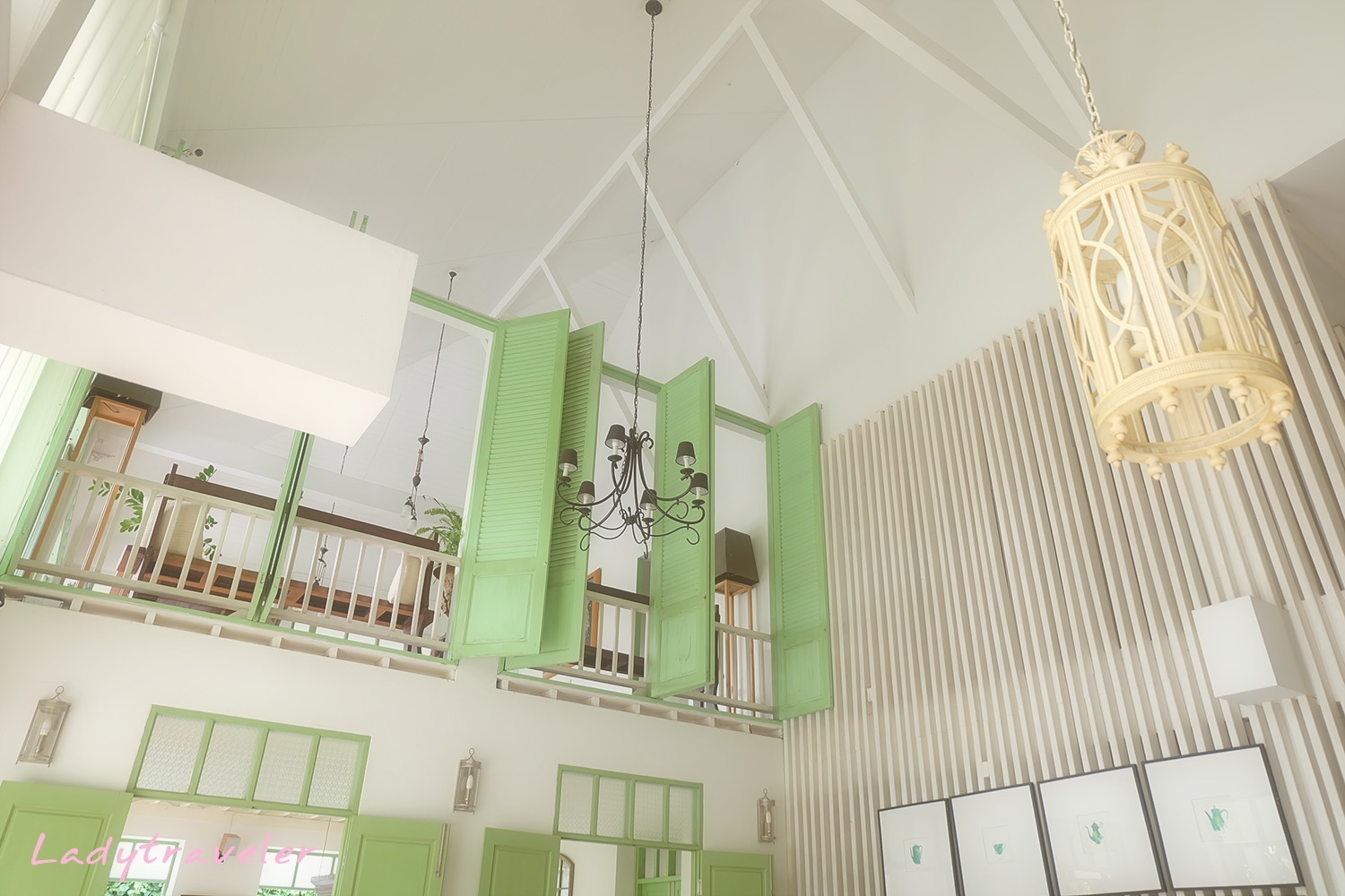ดีไซน์ Boutique สีขาว เขียว แลดูสบายตา มองขึ้นไปด้านบน เพดานสูง โปร่งสบาย