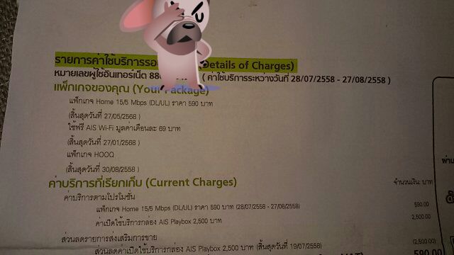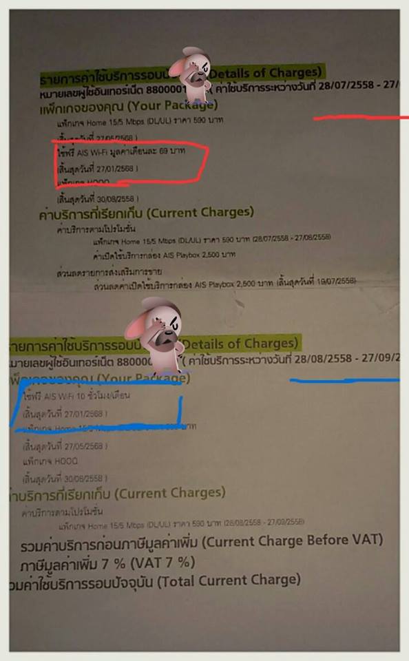 ผมเป็นลูกค้ารายแรกๆที่ซื้อ Ais Fibre โดนติดตั้งเมื่อประมาณเดือน 12/2014 โดยมีโปร 15/5 ในราคา590 บาท โดยต้องผูกสัญญา 1 ปี และสามารถใช้ AIis Wifi แบบ Unlimit เลยตัดสินใจเลือก เพราะในขณะนั้นรายอื่นยังเป็น 10/5 อยู่ และโปรมือถือที่ใช้ ก็ไม่มี Ais Wifi จนต่อมาก็เกิดเรื่องขึ้น ในรอบบิลเดือนนี้ เดือนกันยายน ผมไม่สามารถใช้ชื่อ login เข้าบริการใช้ได้ เลยโทรไปที่ 1185 ได้รับคำตอบว่า username ดังกล่าวใช้ไม่ได้แล้ว ให้ใช้ user ใหม่ และเปลี่ยนมาเป็นจำกัด ใช้ได้เดือนละ 10 ชม.......ตกใจซิครับ ไม่ทราบมาก่อนว่าปรับเป็น 10 ชม. ทั้งๆที่บิลอบเดือนสิงหาคม มันยังบอกว่าผมใช้ Ais Wifi โปร69บาทต่อเดือน ฟรี (เป็นโปร ais wifi unlimit) สิ้นสุด 27/1/2568