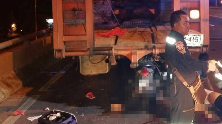 ที่เกิดเหตุ บริเวณคอสะพานข้ามแม่น้ำเจ้าพระยา ช่องเลนซ้ายสุด ขาเข้ารังสิต พบรถบรรทุกสิบล้อ อีซูซุ สีส้ม หมายเลขทะเบียน 80-4151 ปทุมธานี มี นายสำลี จันทร์ไทย อายุ 44 ปี เป็นคนขับ ยืนรอให้การในที่เกิดเหตุ โดยที่ท้ายรถบรรทุก มีรถจักรยานยนต์ฮอนด้า รุ่นเวฟ 110 สีขาว-น้ำเงิน หมายเลขทะเบียน ขวท 126 สุรินทร์ สภาพชนท้าย พังยับเยิน โดยมีร่างนายกันติทัต บุญตะวัน อายุ 20 ปี คนขี่รถจักรยานยนต์เสียชีวิตคาที่ นอกจากนี้ยังพบคนซ้อนท้าย ได้รับบาดเจ็บ ทราบชื่อ น.ส.อัญชลี สุขประเสริฐ อายุ 20 ปี เจ้าหน้าที่กู้ภัยฯ รีบนำส่ง รพ.ปทุมเวช