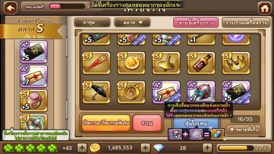 ผมสุ่มไปทั้งหมด 450 เพชร มีกล่องติดวิ๊ง A+ แค่ 3 กล่อง สุ่มครั้งนี้ห่วยจัด จี้แลกหมวก B ก็ไม่มีออกมาเลย ได้หมวก A มาใบเดียว โชคดีหน่อยที่รวมครั้งเดียวแล้วได้หมวกใหม่เลย... (แอบอวด) ใจจริงเว้นท์นี