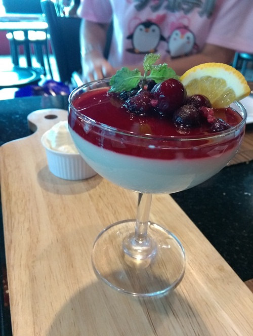 พอดีว่าพนักงานแนะนำเมนูใหม่ พานาคอตต้า ซอสสตอเบอร์รี่ เลยจัดเมนูนี้แทน ซอสสตอเบอร์รี่เข้มข้น หวานๆเปรี้ยวๆ แต่อยากให้สีขาวด้านล่างมีกลิ่นเข้มกว่านี้หน่อยจะได้ตัดกับซอส