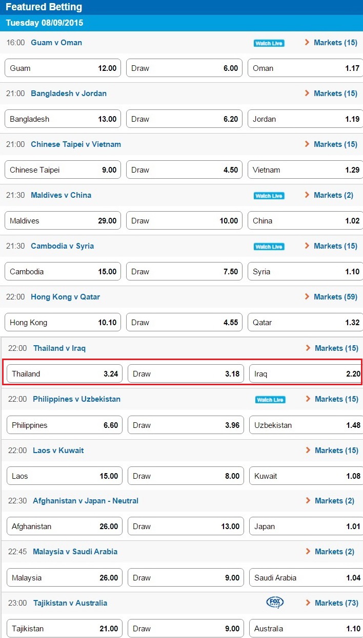 ** ที่มาขอไม่บอกเพราะผมไม่ได้สนับสุนนให้เล่นการพนัน ตารางนี้ยกมาเพื่ออ้างอิงถึงความสามารถที่คนอื่นมองทีมชาติไทย**1