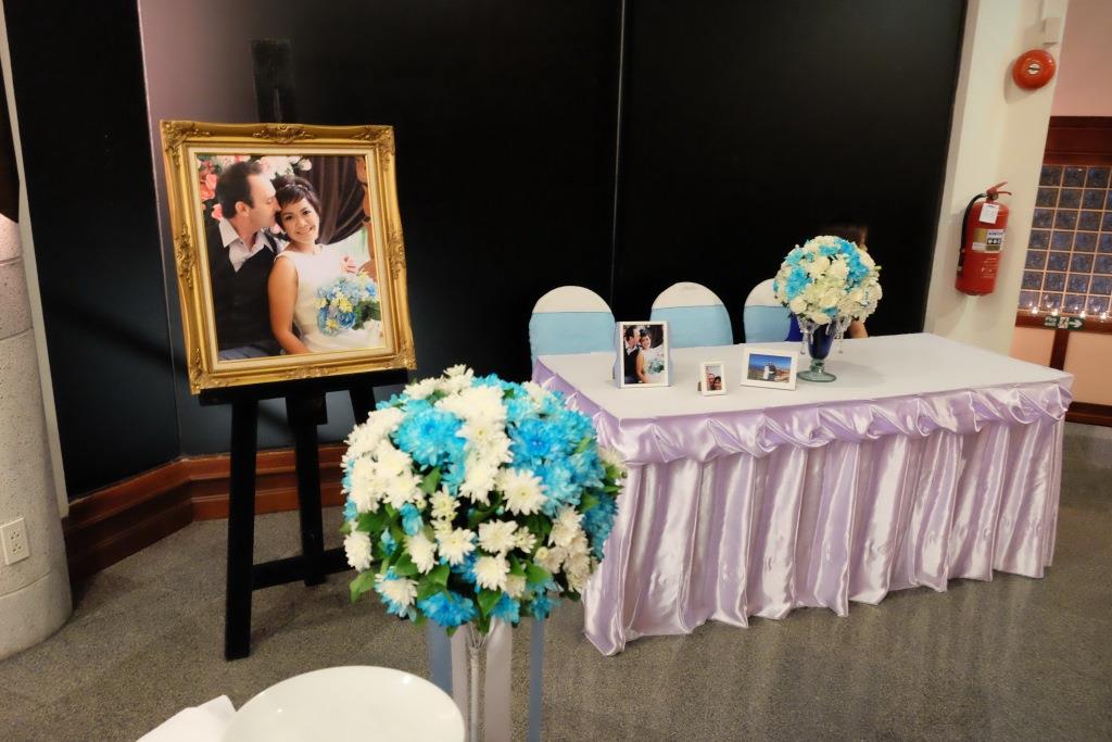 Registration desk where arriving guests signed the "blessing book" and received wedding favours (gifts).