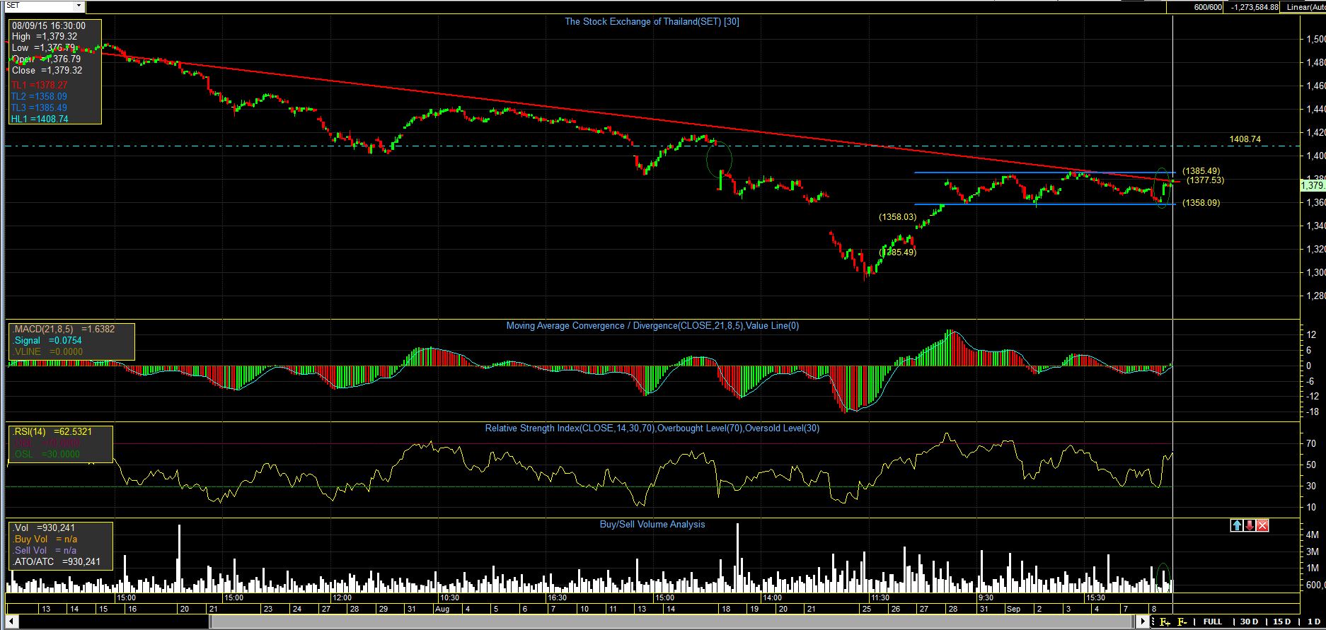 30 Min ก็ยังดูไม่ดีนัก แต่มันน่าเอ๊ะใจตรงเมื่อบ่ายที่มี Volume เข้ามานี่แหละแถมทำแท่งเขียวยาวอีก