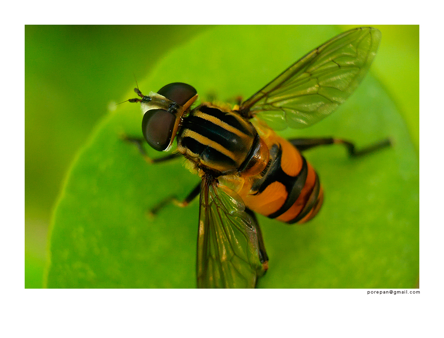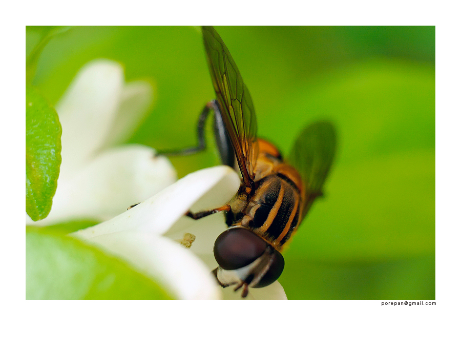 แมลงวันดอกไม้ ลักษณะคล้ายผึ้ง ถ่ายด้วยเลนส์คิท 12-32 + AF tube (เพิ่งสอยมาได้ 2 วัน) ตอนแรก...นึกกว่าจะถ่ายง่ายกว่ามาโครมือหมุน