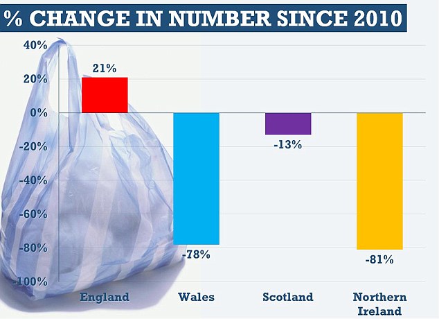 หากร้านค้าให้ถุงฟรี จะถูกปรับ 5000 ปอนด์ แต่เงื่อนไขรายละเอียดมีอีกมากว่าซื้ออะไรจะใส่ถุงได้ ที่สำคัญในแคว้นเวลล์ ทำแล้วตั้งแต่ปี 2011 ลดการใช้ถุงพลาสติกลงได้มากกว่า 70 %