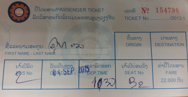 เราซื้อตั๋วรถระหว่างประเทศ ไปลงที่ขนส่งจังหวัดอุดรธานี ในราคาคนละ 22,000 กีบ รวมเป็นเงิน 44,000 กีบ