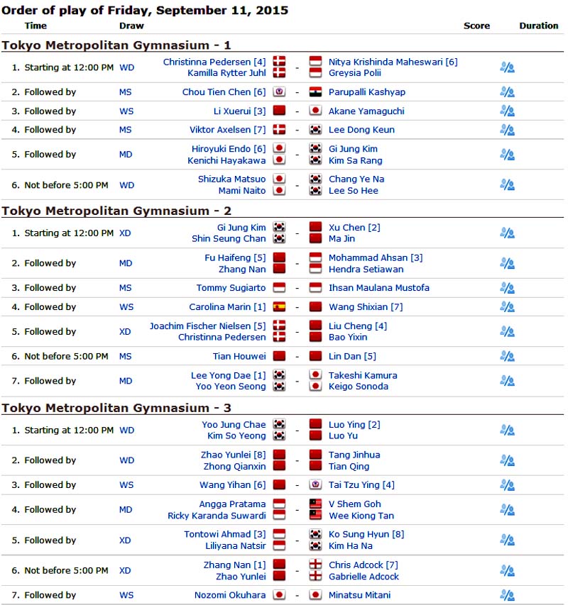 โปรแกรมการแข่งขันแบตมินตัน Yonex Open Japan 2015 [11 ก.ย. 58] : รอบก่อนรองชนะเลิศ (คู่แรก 10.00 น.)