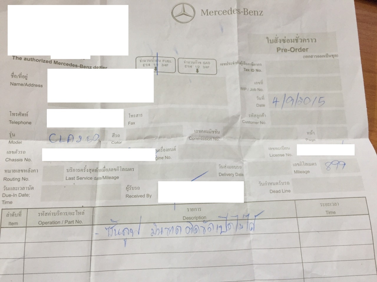 อันนี้เป็นใบสั่งซ่อมครับ บอกอาการว่าซันรูฟติดขัดเปิดไม่ได้ แต่ผมไม่ในใจว่ากรณีแบบนี้ ลงชื่อศูนย์ที่ออกรถได้หรือเปล่า แต่ผมเซ็นเซอร์ไว้ก่อนละกัน อันไม่เซ็นผมอัพไว้บนบล็อกนะครับ