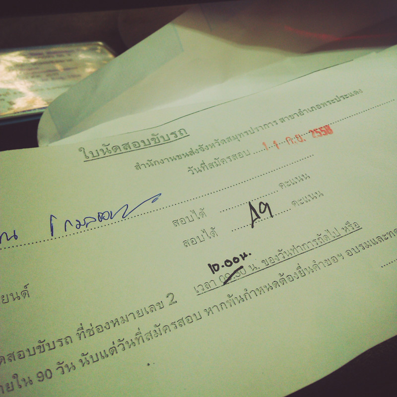 ณ ขนส่งพระประแดง สมุทรปราการ อ่านหนังสือผ่านๆก่อนสอบไป 1 วัน (มั่นใจและไม่มั่นใจเท่าไร) แต่ 8 ปีที่ขี่มาถ้าสอบไม่ผ่านก็นะ..แสดงว่าประสบการณ์ไม่ได้ช่วยอัลไล