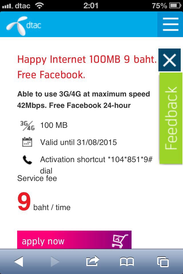 ตามภาพด้านล่าง เป็นโปรโมชั่นของHappy DTAC ผมสนใจและกดสมัครไป เนื่องจากเข้าใจผิดว่าไม่จํากัดวัน เพราะไม่เห็นมีตรงไหนว่าเป็นต่อวัน ยกเว้นใช้ face book ได้ 24ชมฺ