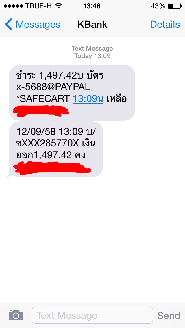 ผมใช้ ช้ K-web shopping card ซื้อของเป็นปกติอยู่แล้ว แต่ครั้งล่าสุด สั่งของทาง ebay ชำระเงินปกติผ่าน paypal ใบเสร็จรับเงินออกมาเรียบร้อย คนขายก็จัดของส่งเรียบร้อย ซึ่งปกติมันจะหักทันทีพร้อม SMS แต่คร