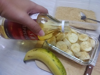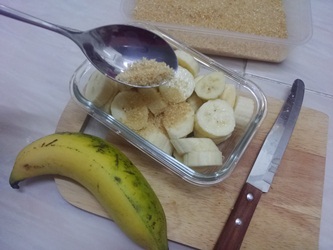 1.นำกล้วยหอมมาหั่นเป็นแว่นๆ แล้วใส่ลงในกล่องถนอมอาหาร พร้อมกับนำน้ำตาลทรายมาโรยให้ทั่วกล้วยหอม