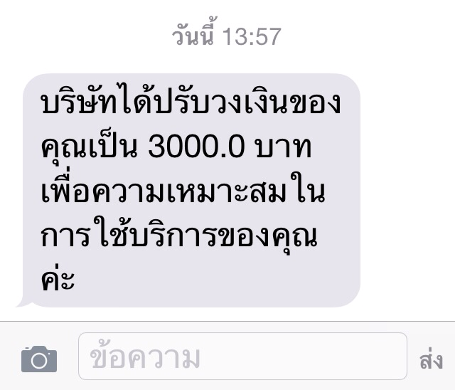 พอดีได้รับ SMS จากทรูแจ้งว่า ปรับวงเงินให้เราเพิ่ม แต่เราเคยแจ้งทางทรูไปหลายครั้งแล้วว่าเราอยากจะใช้วงเงินเดิม ทางคอลเซ็นเตอร์แจ้งว่าถ้าเราใช้ไม่ถึงวงเงินก็ไม่มีผลกับเรา แต่ครั้งนั้นก็แจ้งไปละค่ะว่าต้องการวงเงินเท่าเดิม วันนี้ดันมีSMS เข้ามาแบบนี้อีกละค่ะ เพลีย