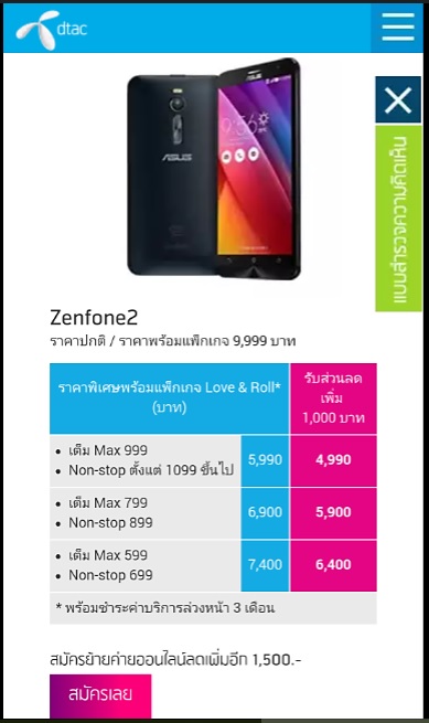 จากโปรซื้อเครื่อง 4G โดยดีแทค อย่างเซนโฟน2 รายเดือน 599 บาท ราคาเครื่อง 7400 บาท