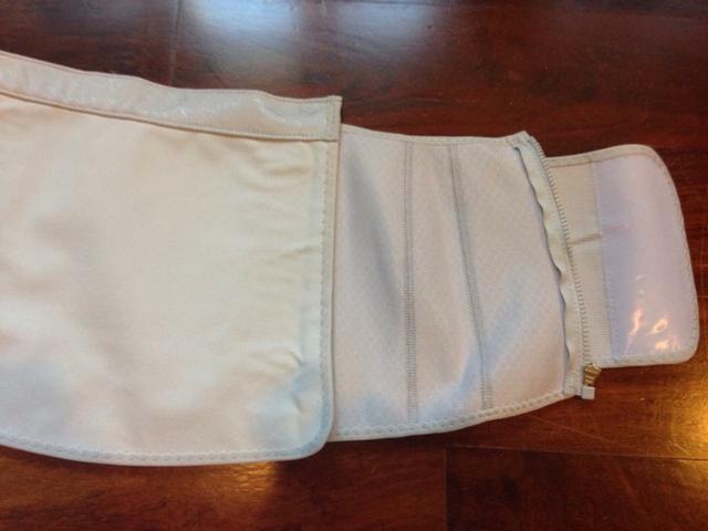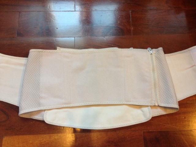 ผ้าคาดหน้าท้องแบ่งเป็น 3 ส่วน ปีกซ้าย ขวา และส่วนกลางที่มีแถบกาวพิเศษ พร้อมตัวเลขเพื่อง่ายในการปรับขนาด และบอกถึงพัฒนาการของการลดสัดส่วนอย่างชัดเจน