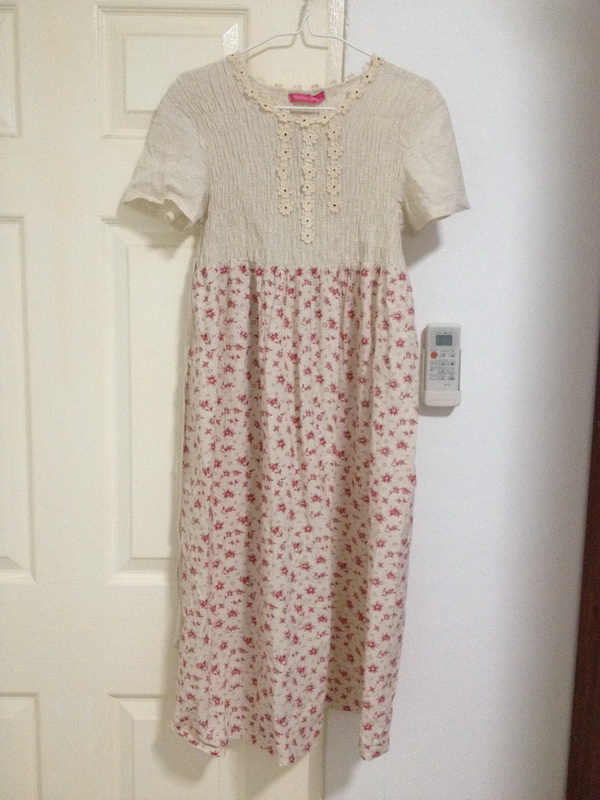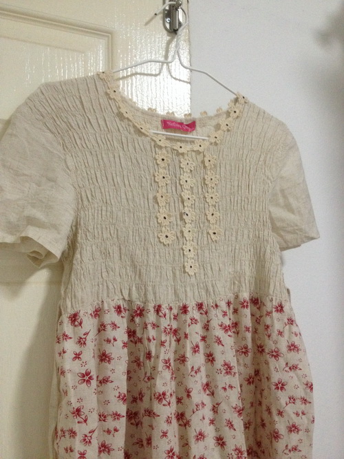 ชุดที่ 2 ชุดลายดอกสีแดงพื้นครีม มีดอกไม้รอบคอสวย ชุดด้านบนเป็นแบบสม็อคยือได้เยอะมาก