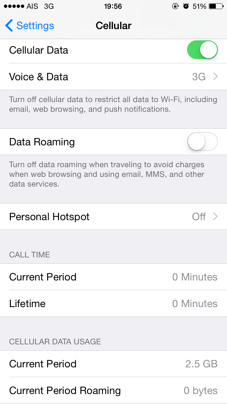 ปกติอยู่บ้าน มือถือไอโฟนผมจะต่อเนตผ่านไวไฟตลอดครับ แต่เปิด cellular data ไว้ เมื่อคืนมี sms จากดีแทคว่าผมใช้งาน 3G ไปแล้ว 0.8GB จาก 1GB ไม่ถึงหนึ่งนาที ก็มีข้อความมาใหม่ว่าผมใช้งานเกิน 1GB แล้ว วันน