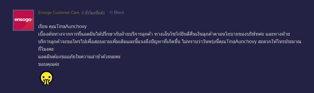 ปล. ท้ายสุดเห็นมีเพื่อนสมาชิกได้ไปที่ออฟฟิศของ Ensogo และได้ยื่นเรื่องขอคืนเงินเป็นที่เรียบร้อยแล้ว ก็รอดูกันต่อไปว่าจะได้รับเงินคืนกันเมื่อไหร่ครับ