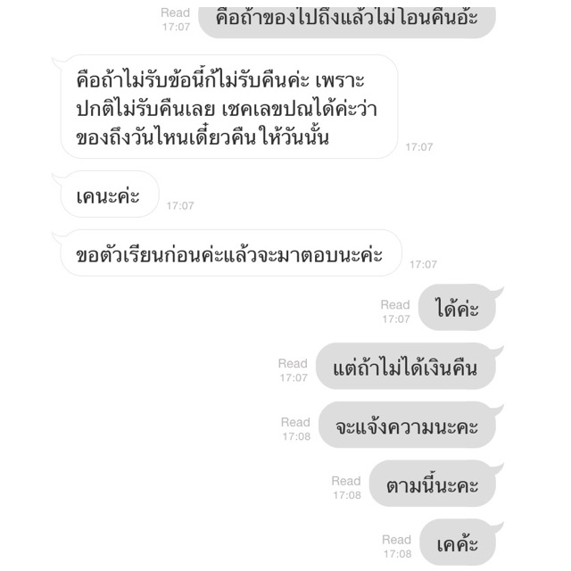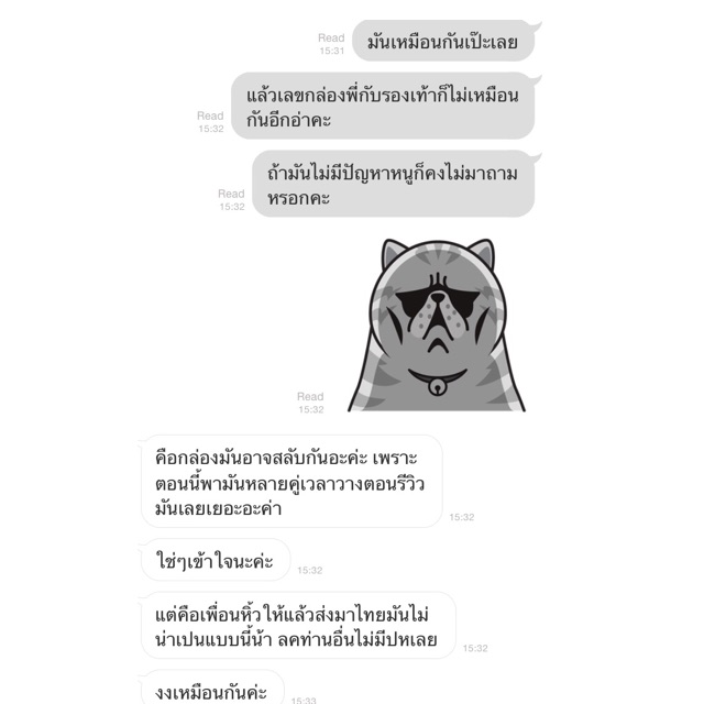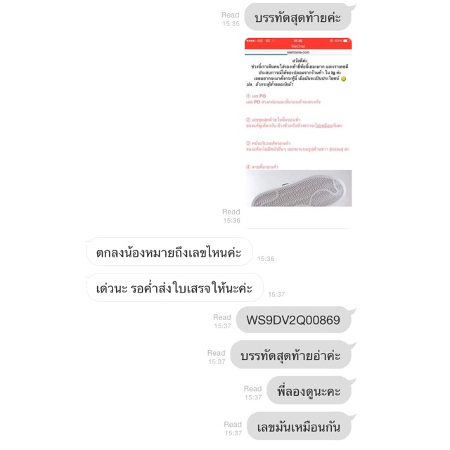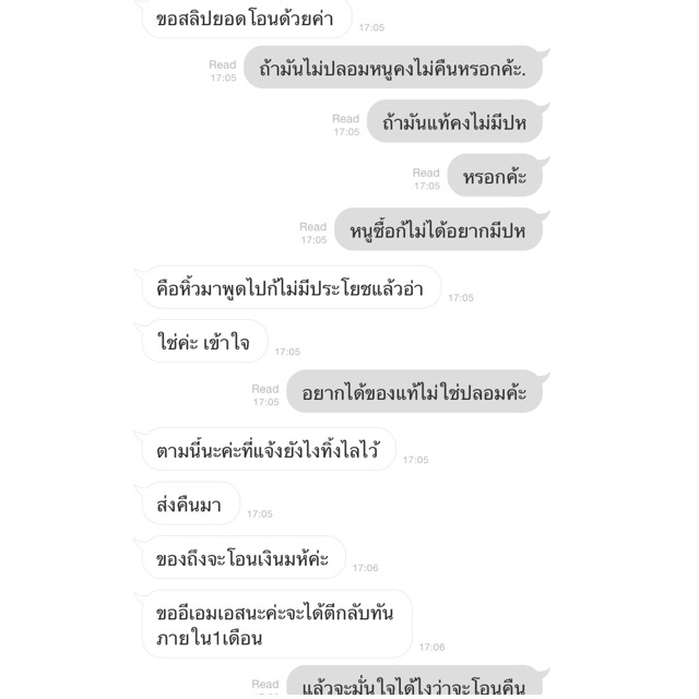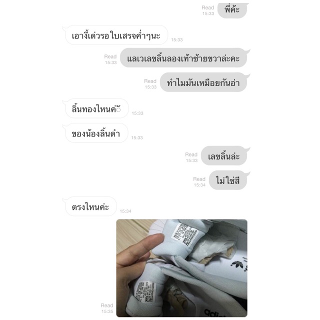 แล้วเราก็รีบไลน์ไปถามร้านเลยค่ะก็คุยกัน ร้านเค้าก็ตอบไม่ตรงคำถาม (เดี๋ยวลงแชทที่คุยกับทางร้านไว้ให้นะคะ) ความรู้สึกตอนนั้นเฟลมากเลยอ่ะค่ะ แล้วก็คุยกับร้านไปเรื่อยๆ ร้านเค้าก็เหมือนไม่ยอมรับเราก็เลยบอกไปว่าเดี๋ยวจะไปที่ช้อปadidasที่เซนลาดไปให้เค้าเช็คว่ามันเป็นของจริงหรือป่าว ถ้าไม่ใช่ของจริงเราบอกทางร้านไปว่า "หนูจะแจ้งความนะคะ" คือดูก็รู้ว่าปลอมแต่พูดไปทางร้านก็ตอบไม่ตรงคำถามไม่รู้จะพูดยังไงแล้วค่ะ (ในใจหงุดหงิดมากเลยยย พูดไงเค้าก็ตอบวนมาที่เดิม) ก็เลยตัดสินใจไปช้อป adidas ค่ะ เราก็รีบโทรหาเพื่อนบอกให้เพื่อนไปส่งเซนลาดหน่อยและบอกไปว่าได้รองเท้าของปลอมมา แต่ก็เปลี่ยนแพลนไป central world แทนค่ะเพราะคิดว่าช้อปน่าจะใหญ่กว่า พอไปถึงcentral world ก็มุ่งดิ่งไปที่ช้อปเลยค่ะ แล้วก็บอกพี่ที่ช้อปไปว่า" พี่ค่ะ ช่วยเช็คให้หน่อยได้ไหมว่ามันเป็นของจริงหรือว่าปลอม" พี่เค้าก็ใจดีดูให้นะคะ (ในใจก็คิดอยู่แล้วว่ามันของปลอมออร่าออกซะขนาดนั้น) ผลปรากฎว่าของปลอมจริงๆด้วยค่าาาา~ พี่ที่ช้อปก็บอกให้ไปแจ้งความ แล้วก็ให้เบอร์ของทางช้อปมาแล้วบอกให้ส่งให้เจ้าของร้าน แล้วให้บอกเจ้าของร้านว่าถ้าไม่เชื่อว่าของปลอมก็โทรมาที่ช้อป (เพราะเจ้าของร้านเค้าไม่ยอมรับอ่ะค่ะว่าของปลอม) สุดท้ายก็ส่งไปให้ร้านแล้วคุยกันกับทางร้านต่อ ทางร้านเค้าบอกก็ให้ส่งของกลับ เราก็ส่งกลับไปแบบใจใจค่ะ เพราะเค้าบอกว่าจะโอนเงินคืนให้ก็ต่อเมื่อได้ของคืน (เรามีหลักฐานทุกอย่างมีชื่อบัญชีเลขบัญชีที่อยู่เจ้าของร้านเพราะเค้าให้เราตอนส่งสินค้ากลับและหลักฐานเยอะแยะเลยค่ะ คือพร้อมที่จะแจ้งความถ้าร้านไม่โอนเงินคืนมาให้) เราส่งแบบ Ems ไปอ่ะค่ะเพราะทางร้านเค้าแจ้งมาแบบนั้น เราก็เช็คไปรษณีย์ตลอดนะคะ ว่าของถึงล่ะยัง สุดท้ายความซวยครั้งนี้เหมือนยังมีแสงสว่างของความโชคดีอยู่ปลายทาง คือทางร้านเค้าได้ของคืนไปแล้วก็โอนเงินคืนกลับมาให้