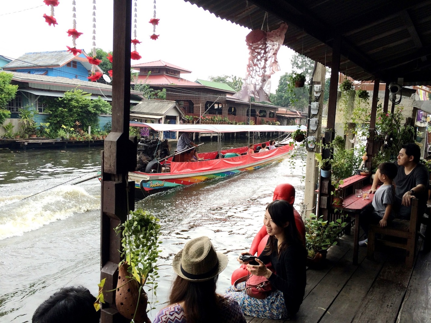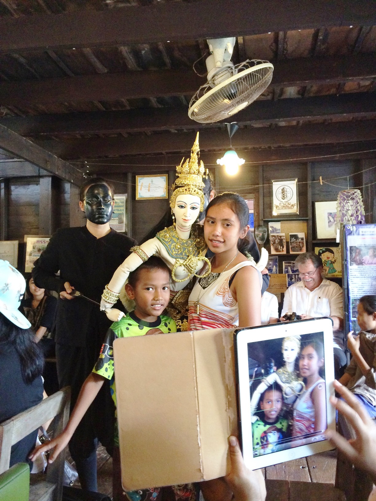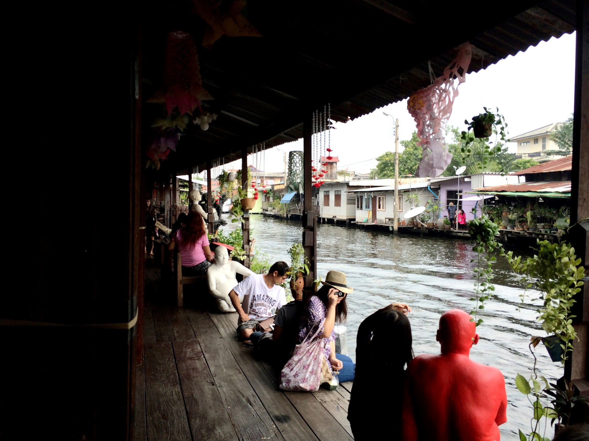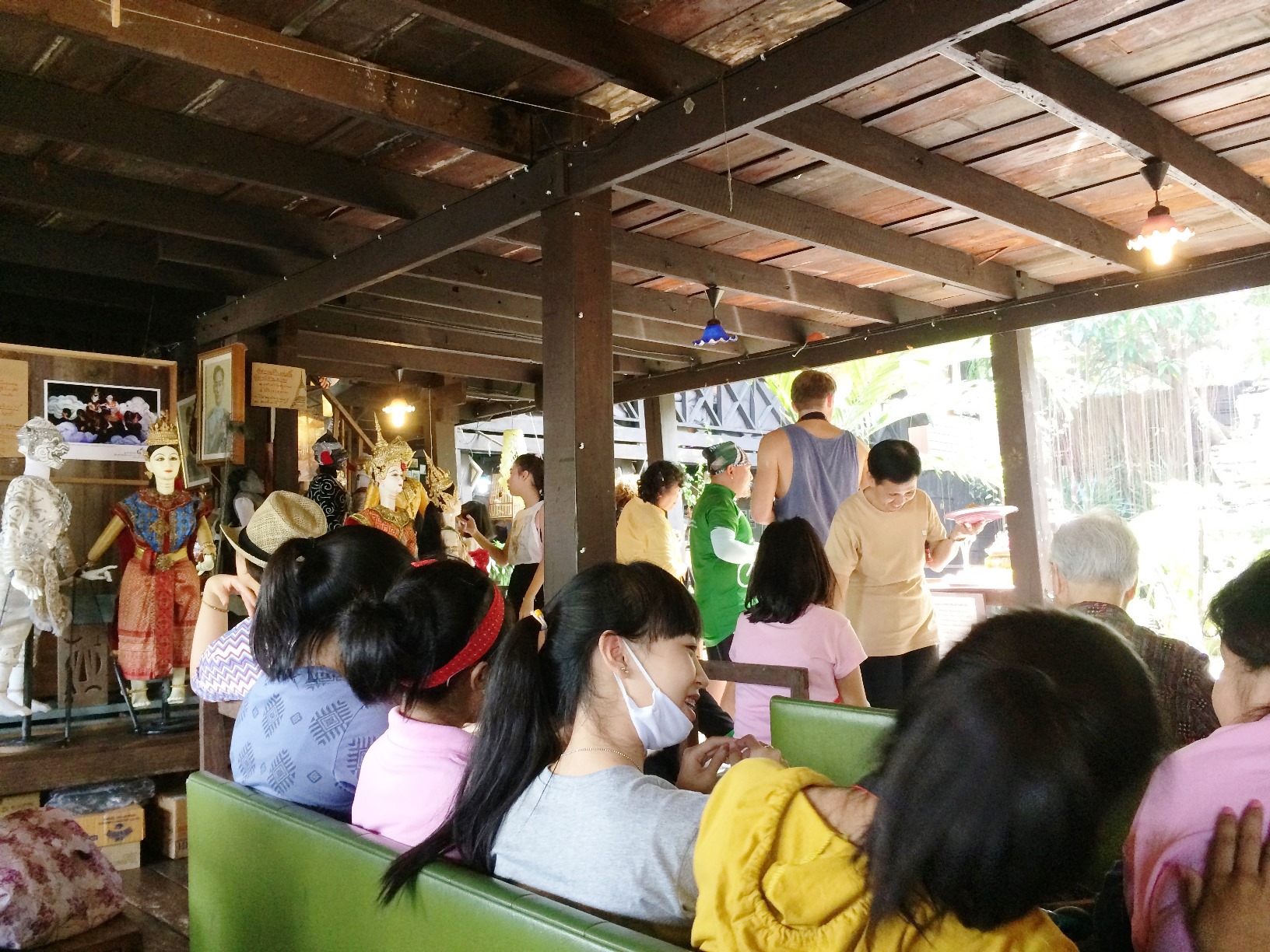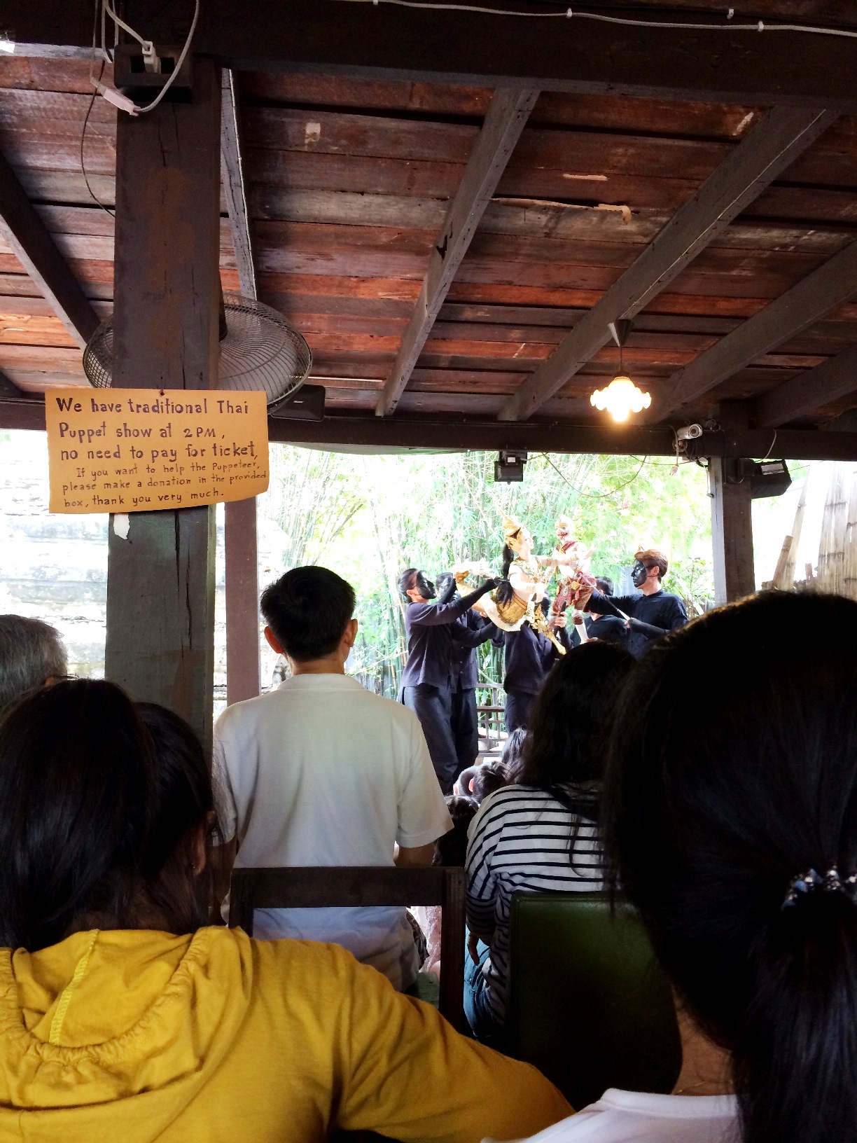 ชาวไทยและชาวต่างชาติที่มาที่นี่ นั่งเรียงแถวสงบเสงี่ยมรอดูหุ่นละครเล็กที่นี่ทั้งนั้น ละครมีรอบบ่ายสองโมงค่ะ ใครมาแต่เช้าก็เดินเล่นไปก่อน จิบกาแฟไป อ่านหนังสือไป ใครจะหอบงานมาทำเพลินๆก็ได้ เพราะที่นี่เงียบสงบ เสียงที่ได้ยินคงมีแต่เสียงเรือหางยาวคอยรับส่งผู้โดยสาร และเสียงคลื่นจากเรือที่กระทบริมฝั่งเท่านั้น