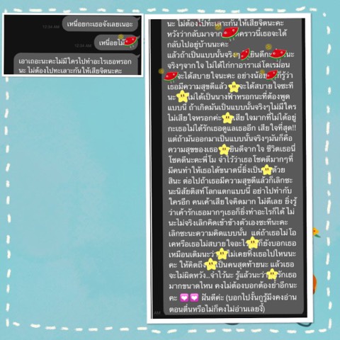 แล้วถ้าเป็นแบบนั้นจริงๆ...ยินดีกะพี่...นะ จริงๆจากใจ ไม่ได้ไก่กาอาราเล่โดเรม่อน จะได้สบายใจนะคะ อย่างน้อย...ก็รู้ว่าเธอมีความสุขดีแล้ว ...จะได้สบายใจซะทีนะ ...ไม่ได้เป็นนางฟ้าหรอกนะที่ต้องพูดแบบนี้ ถ้าเกิดมันเป็นแบบนั้นจริงๆไม่มีใครไม่เสียใจหรอกค่ะ ...เสียใจมากที่ไม่ได้อยู่กะเธอไม่ได้รักเธอดูแลเธออีก เสียใจที่สุด!! แต่ถ้ามันออกมาเป็นแบบนั้นจริงๆมันก็คือความสุขของเธอ ....ยินดีจากใจ ชีวิตเธอนี่โชคดีนะคะพี่... จำไว้ว่าเธอโชคดีมากๆที่มีคนทำให้เธอได้ขนาดนี้ยิ่งเป็น...ด้วยสินะ ต่อไปถ้าเธอมีความสุขดีแล้วก็เลิกซะนะนิสัยติสท์โลกแตกแบบนี้ อย่าไปทำกับใครอีก คนเค้าเสียใจคิดมาก ไม่ดีเลย ยิ่งรู้ว่าเค้ารักเธอมากๆเธอก็ยิ่งทำอะไรก็ได้ ไม่นะไม่จริงเลิกคิดเข้าข้างตัวเองซะทีนะคะ เลิกซะนะความคิดแบบนั้น แต่ถ้าเธอไม่โอเคหรือเธอไม่สบายใจอะไร...ก็ยังบอกเธอเหมือนเดิมนะว่า...ไม่เคยทิ้งเธอไปไหนนะคะ ให้คิดถึง...เป็นคนสุดท้ายนะ แล้วเธอจะไม่ผิดหวัง..จำไว้นะ รู้แล้วนะว่า...รักเธอมากขนาดไหน คงไม่ต้องบอกต้องย้ำอีกนะคะ 💟💟 ฝันดีค่ะ (บอกไปงั้นกูรู้คงอ่านตอนตื่นหรือไม่ก็คงไม่อ่านเลยงี้)