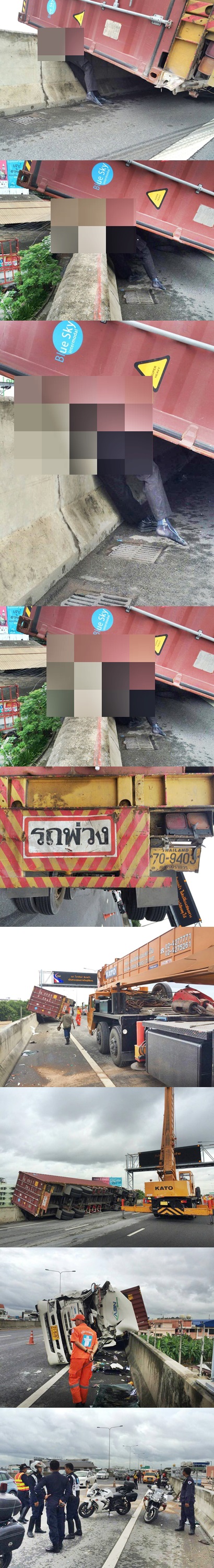 18/09/58 เวลา 07.30 ว.40 ด่วนฉลองรัฐ ก่อนลงด่วนสุขาภิบาล5 รถบรรทุกพลิกคว่ำผุ้ขับขี่รถบรรทุกติดภายในรอตัดถ่างสามารถนำร่างผุ้เสียชีวิตออกมาได้