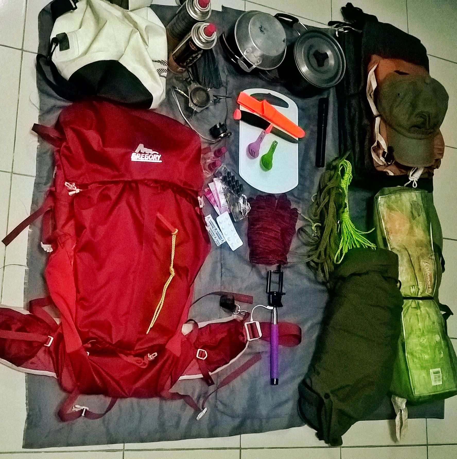 เต้นท์ ถุงนอน ผ้าห่ม อาหาร ข้าวสาร เครื่องดื่ม มันฝรั่งเกือบ 2 กิโล มันเทศ 5 กิโล เเละ อื่นๅอีกเยอะเเยะ เน้นหนักไปที่ของกิน ประเภทว่าเกินไว้ดีกว่าขาด