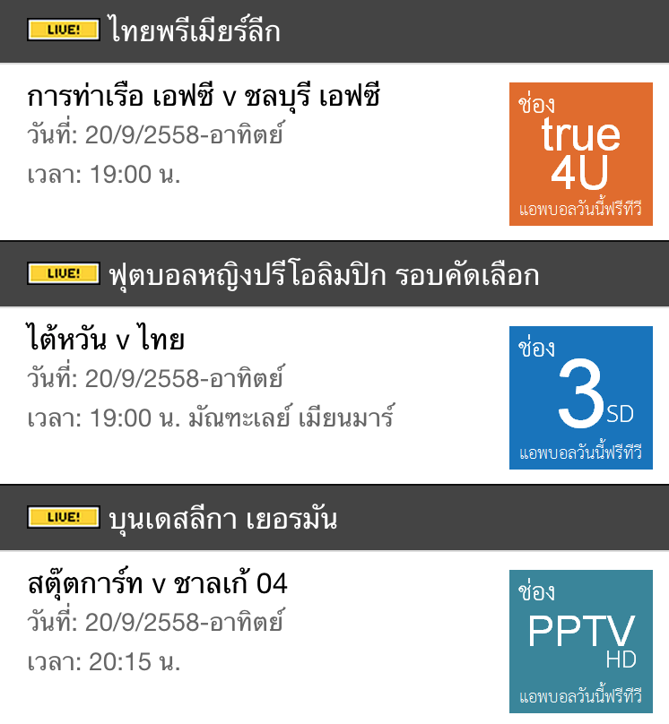 โปรแกรมถ่ายทอดสดฟุตบอลทางช่อง PPTV สัปดาห์นี้