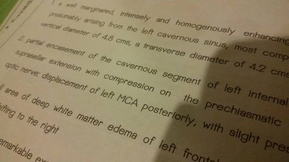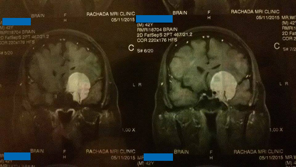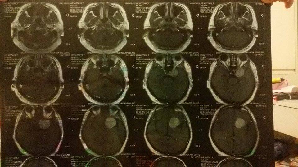 คุณหมอสัณฑน์พลฯ (เพื่อนทันตกรรมผมแนะนำมา) หมอผ่าตัดตาที่ศูนย์แพทย์พัฒนาฯ จะไปผ่าตัดดึงหนังตาซ้ายที่ตกมาหลายปี ยกขึ้น เพื่อไม่ให้เสียบุคคลิก..คุณหมอเก่งจริงๆ ครับ ทดสอบ โน่น นี่ นั่น สุดท้ายคุณหมอท่านบอกว่า "เบิกได้ไหม" ผมทำงานรัฐวิสาหกิจ ตอบทันทว่า "ได้ครับ" คุณหมอท่านคงสงสัย แต่ยังไม่ยอมบอก คุยไป ยิ้มไป งั้นให้เช็คระบบประสาทเพิ่มอีกนิด ส่งไป MRI ต่อที่รัชดา MRI แล้วนัดดูผลอีก 2 วัน ปรากฏว่า แจ่มครับ เนื้องอกเยิ้อหุ้มสมองประมาณ 5 ซม. คุณหมอบอกว่า “ของผมทีหลังได้ ทำเรื่องนี้ก่อนสำคัญกว่า จะให้ผมดูทีมหมอให้ไหม ถ้ารัฐบาล แนะนำทีมที่รู้จักที่ รพ.จุฬา และ รพ.รามา”