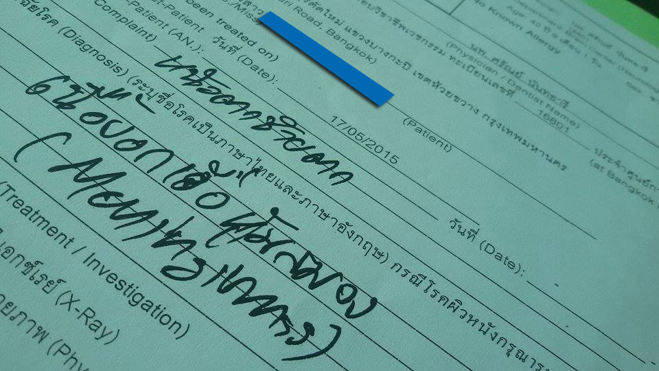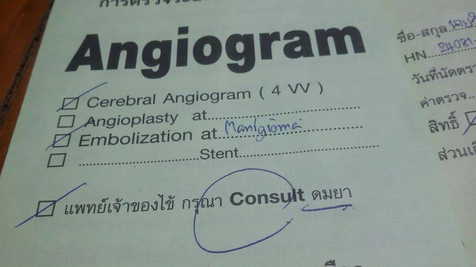 เริ่มจากหมอคนแรก คุณหมอสัณฑน์พลฯ (เพื่อนทันตกรรมผมแนะนำมา) หมอผ่าตัดตาที่ศูนย์แพทย์พัฒนาฯ จะไปผ่าตัดดึงหนังตาซ้ายที่ตกมาหลายปี ยกขึ้น เพื่อไม่ให้เสียบุคคลิก..คุณหมอเก่งจริงๆ ครับ ทดสอบ โน่น นี่ นั่น สุดท้ายคุณหมอท่านบอกว่า "เบิกได้ไหม" ผมทำงานรัฐวิสาหกิจ ตอบทันทว่า "ได้ครับ" คุณหมอท่านคงสงสัย แต่ยังไม่ยอมบอก คุยไป ยิ้มไป งั้นให้เช็คระบบประสาทเพิ่มอีกนิด ส่งไป MRI ต่อที่รัชดา MRI แล้วนัดดูผลอีก 2 วัน ปรากฏว่า แจ่มครับ เนื้องอกเยิ้อหุ้มสมองประมาณ 5 ซม. คุณหมอบอกว่า “ของผมทีหลังได้ ทำเรื่องนี้ก่อนสำคัญกว่า จะให้ผมดูทีมหมอให้ไหม ถ้ารัฐบาล แนะนำทีมที่รู้จักที่ รพ.จุฬา และ รพ.รามา”