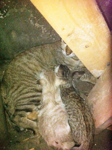 แม่แมวเป็นแมวสามสีนอนให้นมลูกอยู่ใต้เพิงค่ะ เด็กๆตัวผอมๆหัวโตๆตาแป๋วๆค่ะ